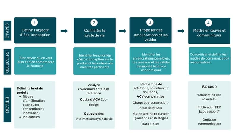 « Global » signifie que l’éco-conception se caractérise par une double approche multicritère et multi-étape en suivant une démarche en quatre étapes selon le niveau d’éco-conception défini en amont par les équipes qui conçoivent et développent les produits.