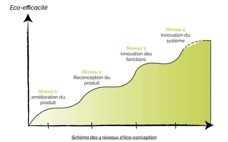 La figure ci-dessous illustre ces quatre niveaux d’éco-conception en fonction de l’amélioration de l’éco-efficacité du produit. Source: Pôle éco-conception​